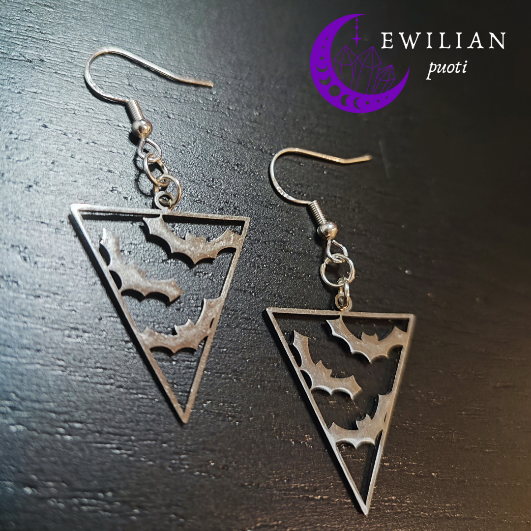 Kolmionmuotoiset korvakorut lepakkokuviolla. Hopeoidut koukut, riipukset terästä.
