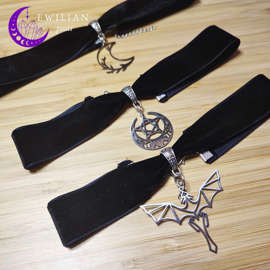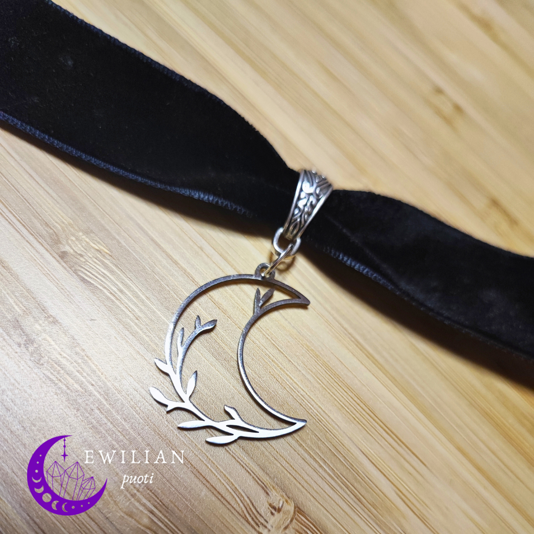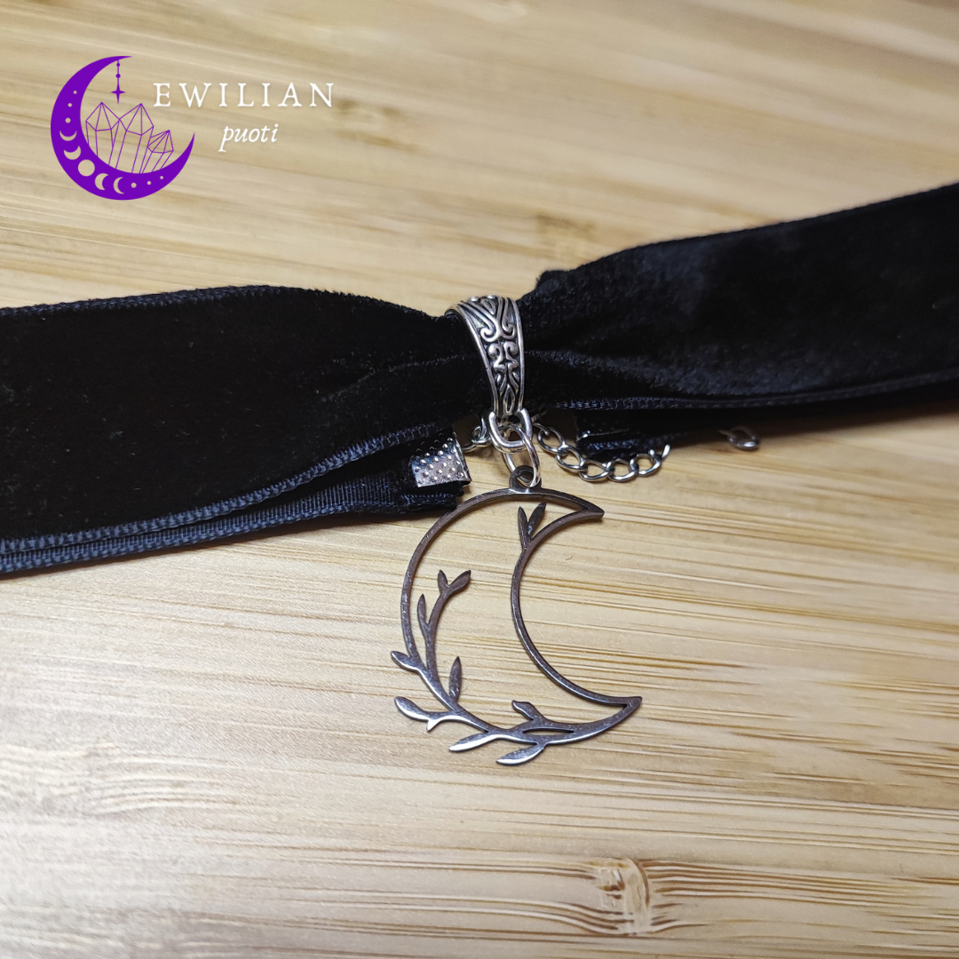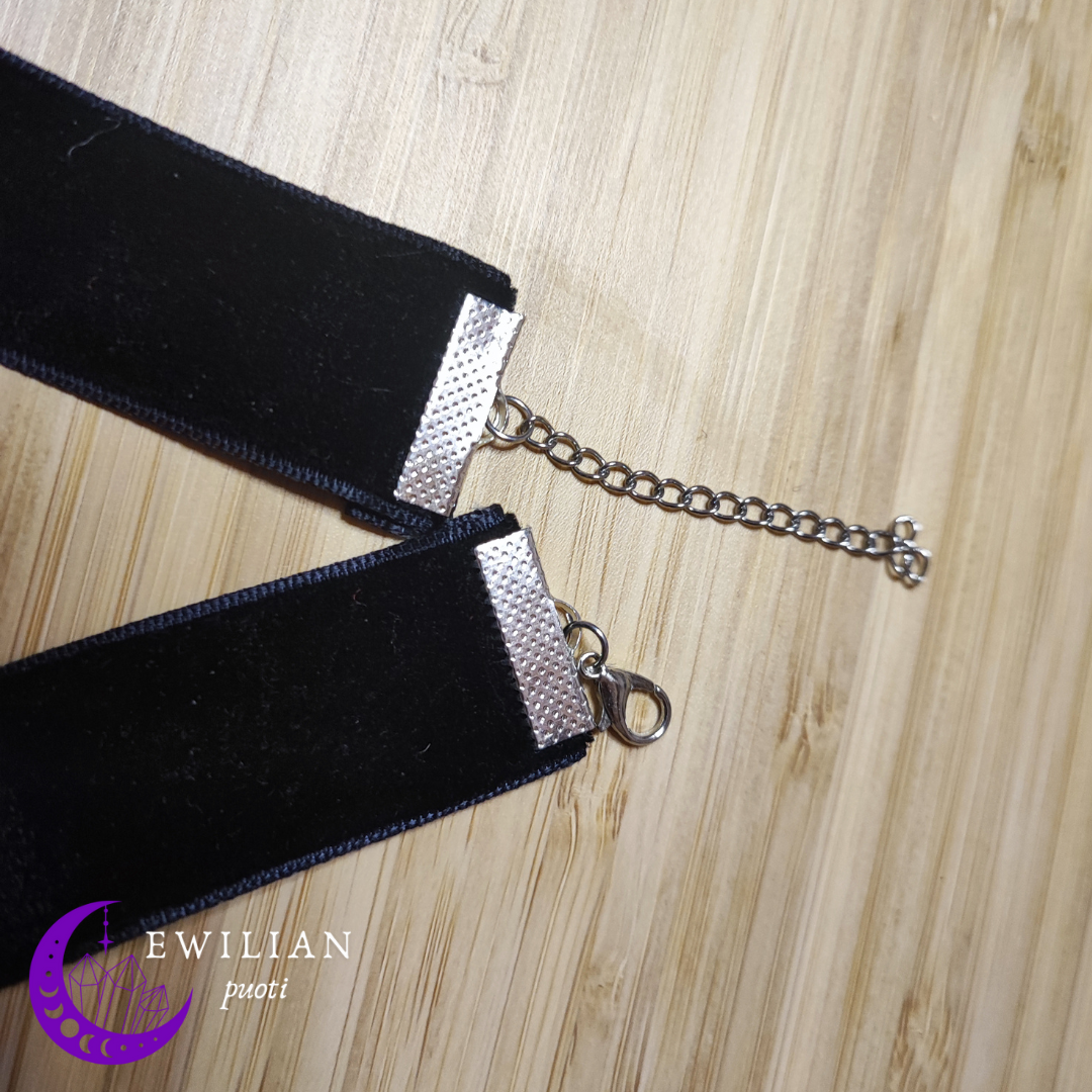 Säädettävä mustahopea samettikaulapanta omilla mitoilla. Samettinauhan leveys 2cm. Riipuksen leveys 2,4cm ja korkeus 3,2cm. Riipus ruostumatonta terästä.