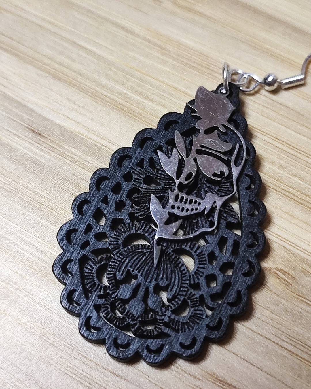 Korviksissa hopeoitu koukku ja riipus mustaa puuta sekä ruostumatonta terästä. Puuosassa upea yksityiskohtainen kuviointi.