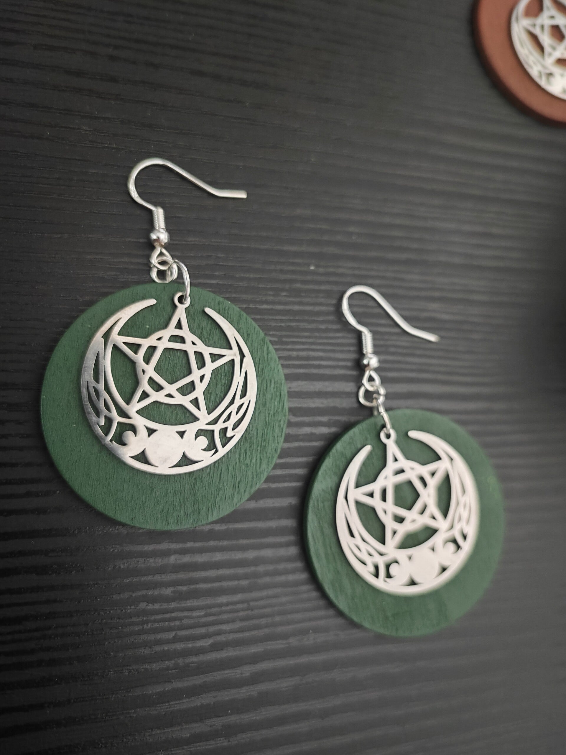 Korviksissa hopeoitu koukku ja riipus vihreää puuta sekä ruostumatonta terästä.